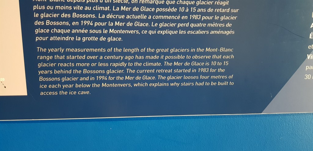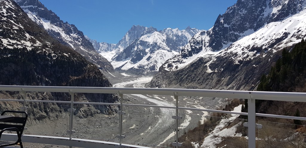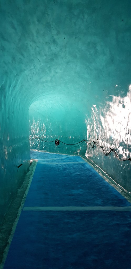 The other attraction we were keen to see was The Mer de Glace (which means sea of ice). It’s the largest glacier in France – 7km long and 200m deep. The scenic rail to get there was the first tourist attraction built in Chamonix in 1908 and the views along the way were beautiful.