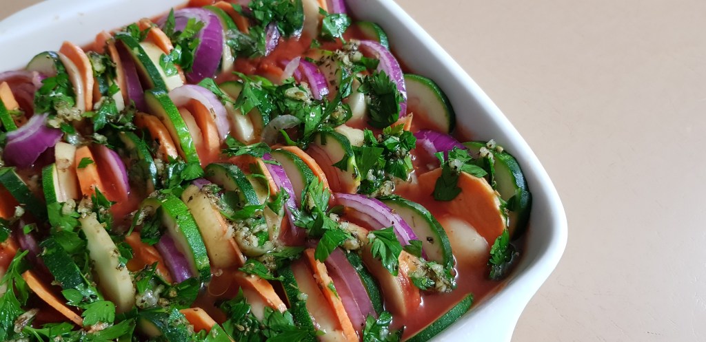 Our route took us on a scenic drive through to Gloucester via the Stroud Road. It was a long drive, surrounded on both sides with grazing land, but most notable was the chicken and egg farms. Sheds full of chickens! A night spent with friends in Gloucester was the perfect stopover. How good does this colourful vegetable bake look that our friends were just about to pop in the oven.