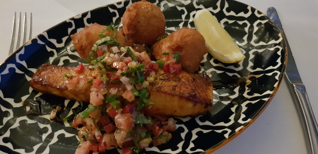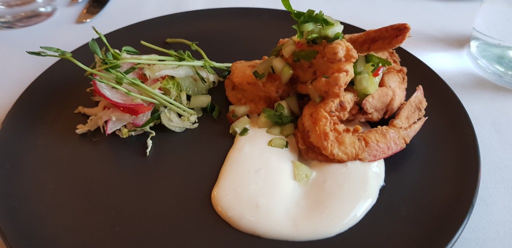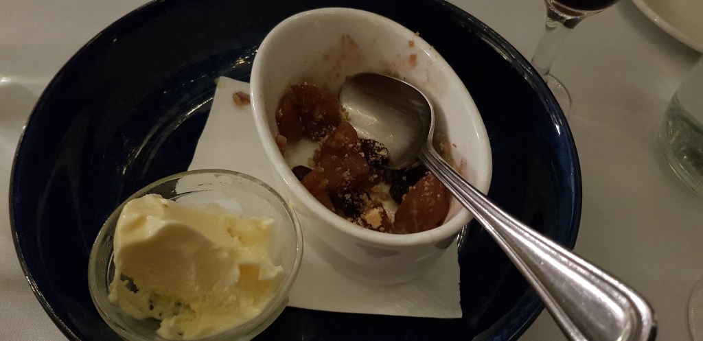 The entre we shared was superb, one of those dishes where you wish you’d ordered one each – salt & pepper prawns with a lemon/horseradish mayo and a lime/tomato salsa. The main was orange & smoked paprika salmon with pumpkin dumplings and walnut salsa. It ticked all the boxes but was a little disappointing as unfortunately the dumplings overpowered the dish. All was saved with the pear, port & raisin crumble served with vanilla ice-cream. It was so good, I forgot to take a photo 🙂