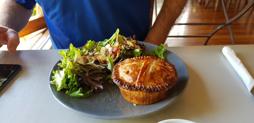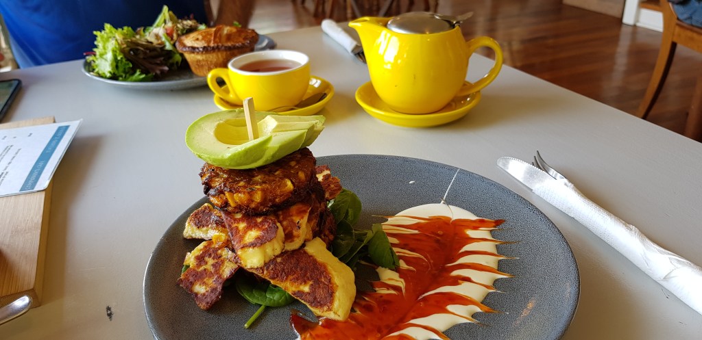 Lunch was at the Components Cafe. I’d have to say that this was the biggest zucchini & corn fritters, haloumi stack I’ve every seen, and paired with a rather large chicken, leek & tarragon pie, we were stuffed. Big meals. Big flavours.
