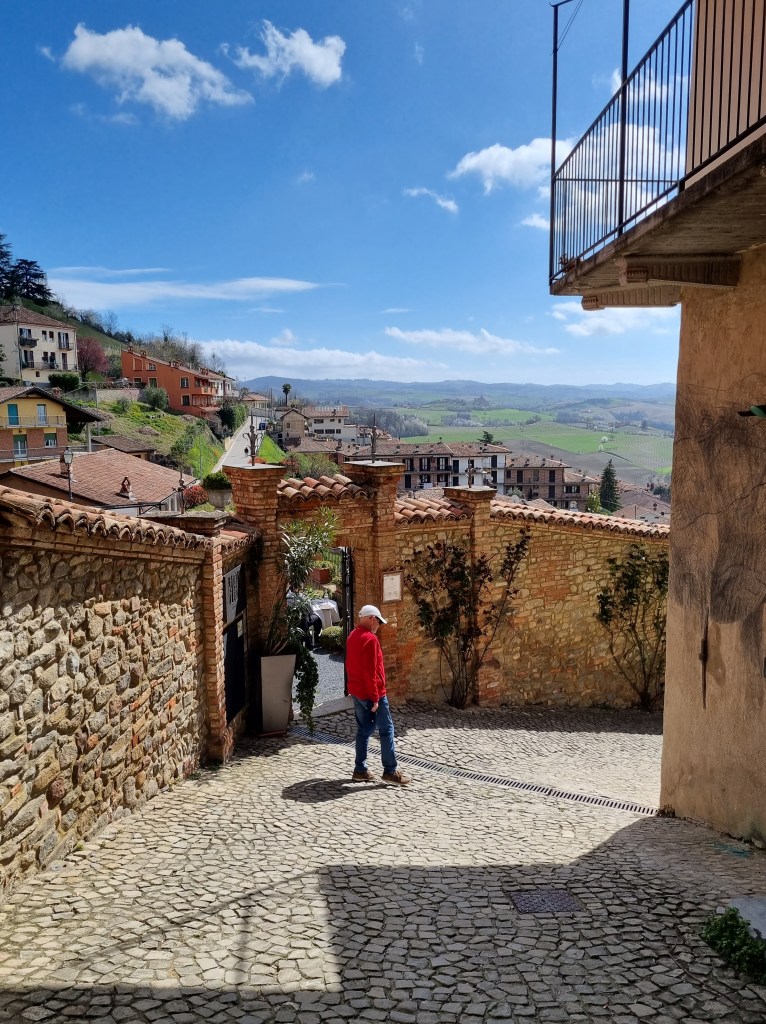 Every Tuesday morning is market day in the nearby town of Dogliani, a short drive through windy hills. Jeff is really getting the hang of our sporty car.